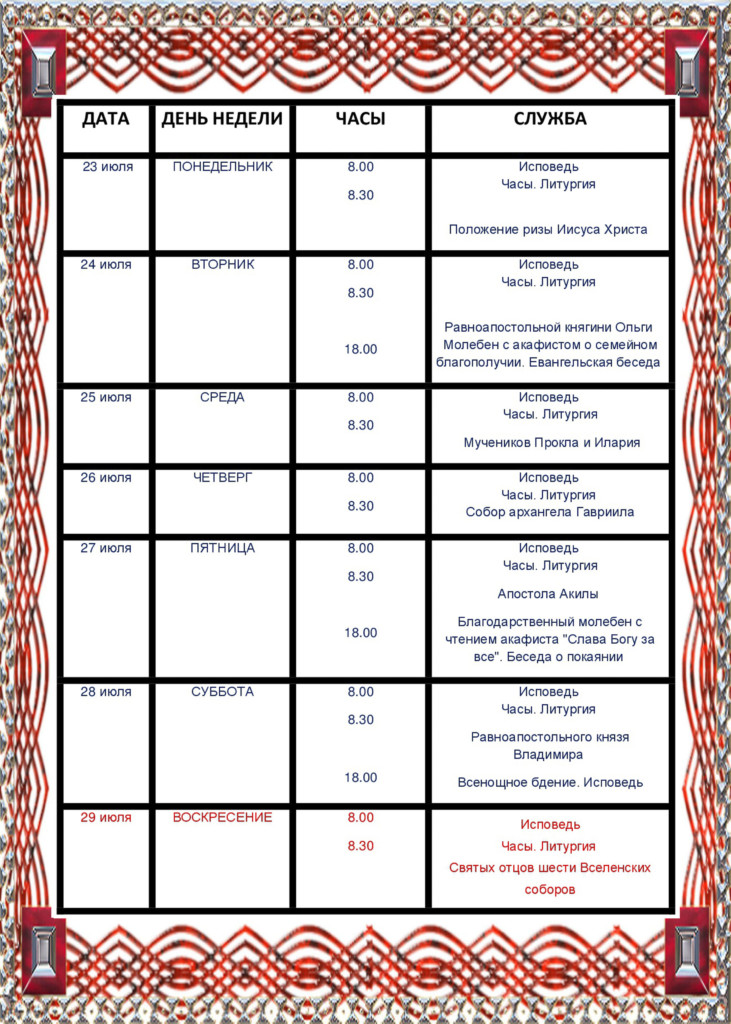 23-29 июля Опубликовано 18.07.2018 731 × 1024 Расписание богослужений ← Пред. След. → Поделиться:TweetВКонтактеНравитсяНравится